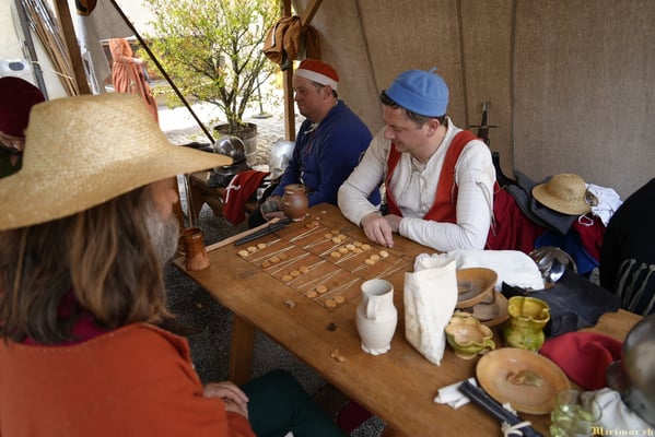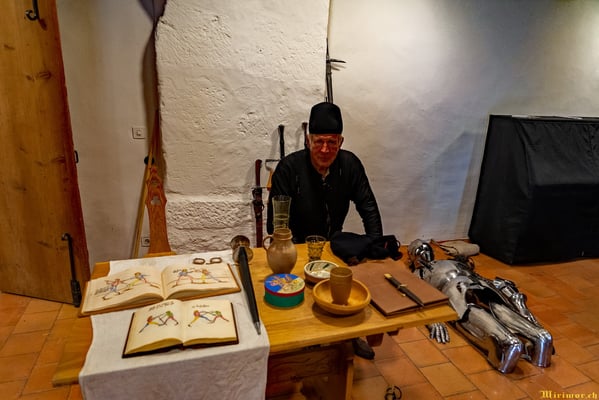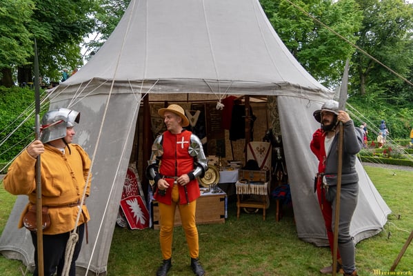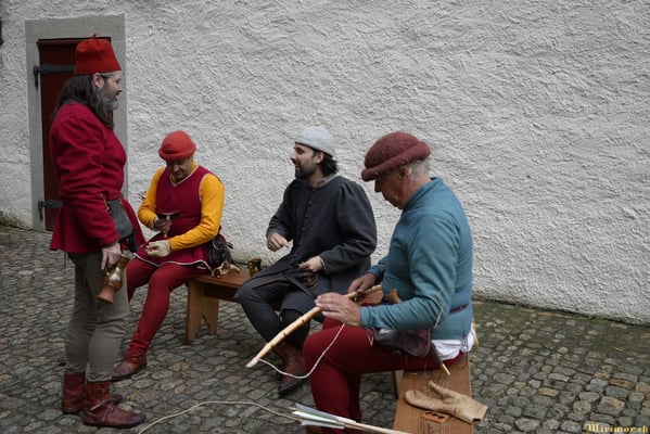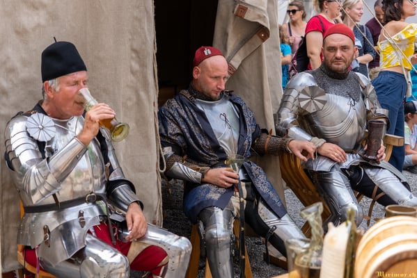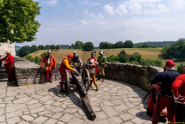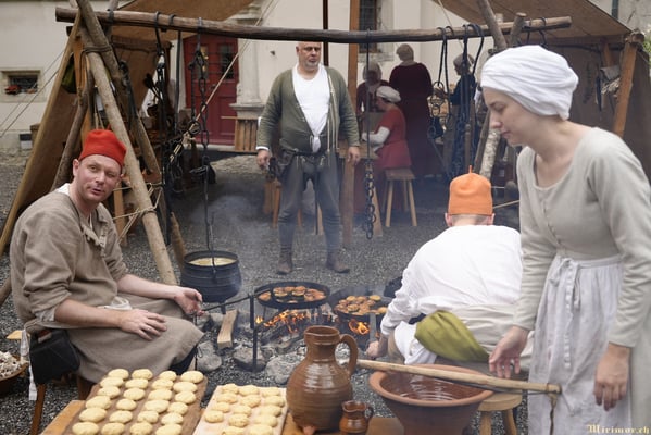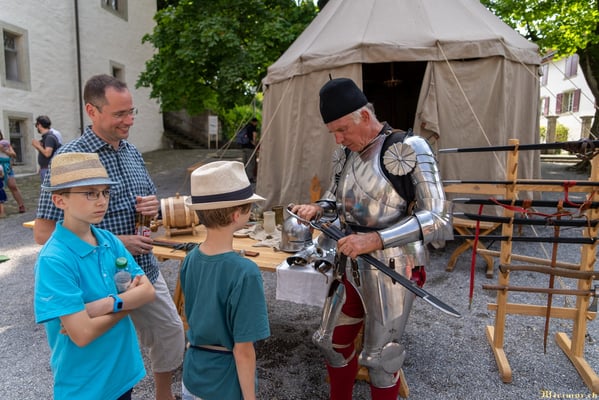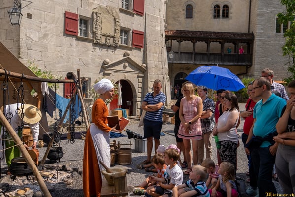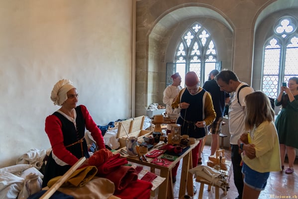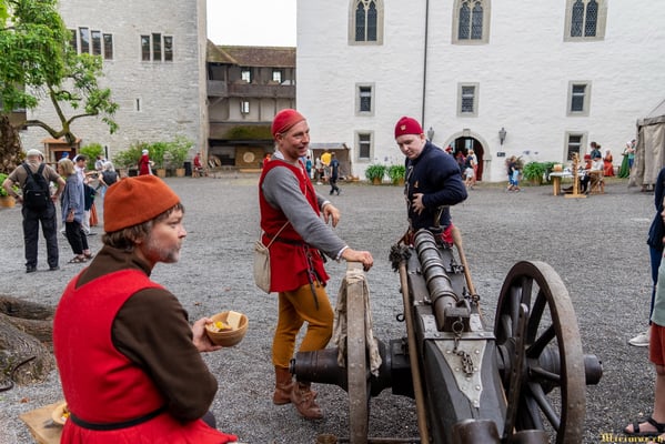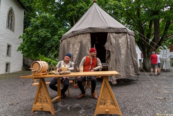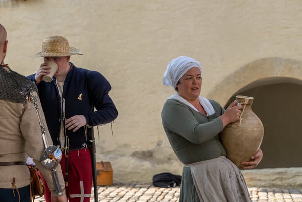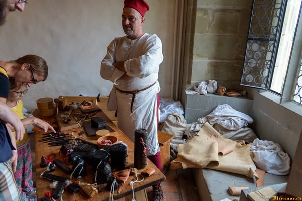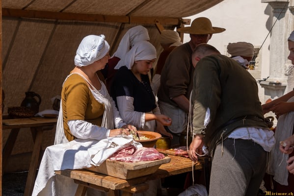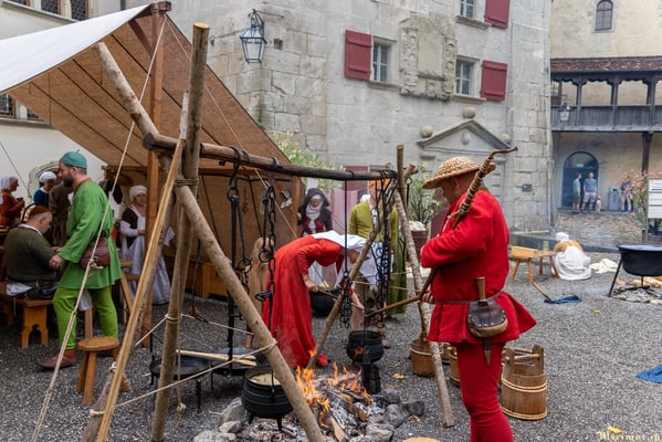 Offiziere und Soldaten schlagen im Hof ihre Zelte auf und lassen das Publikum ins 15. Jahrhundert eintauchen. Es duftet nach mittelalterlichen Speisen, gekocht nach mittelalterlichen Originalrezepten. Handwerkerinnen und Handwerker gehen ihrer Arbeit nach, die Burgbesatzung patrouilliert mit Hellebarden und Kanonen.
